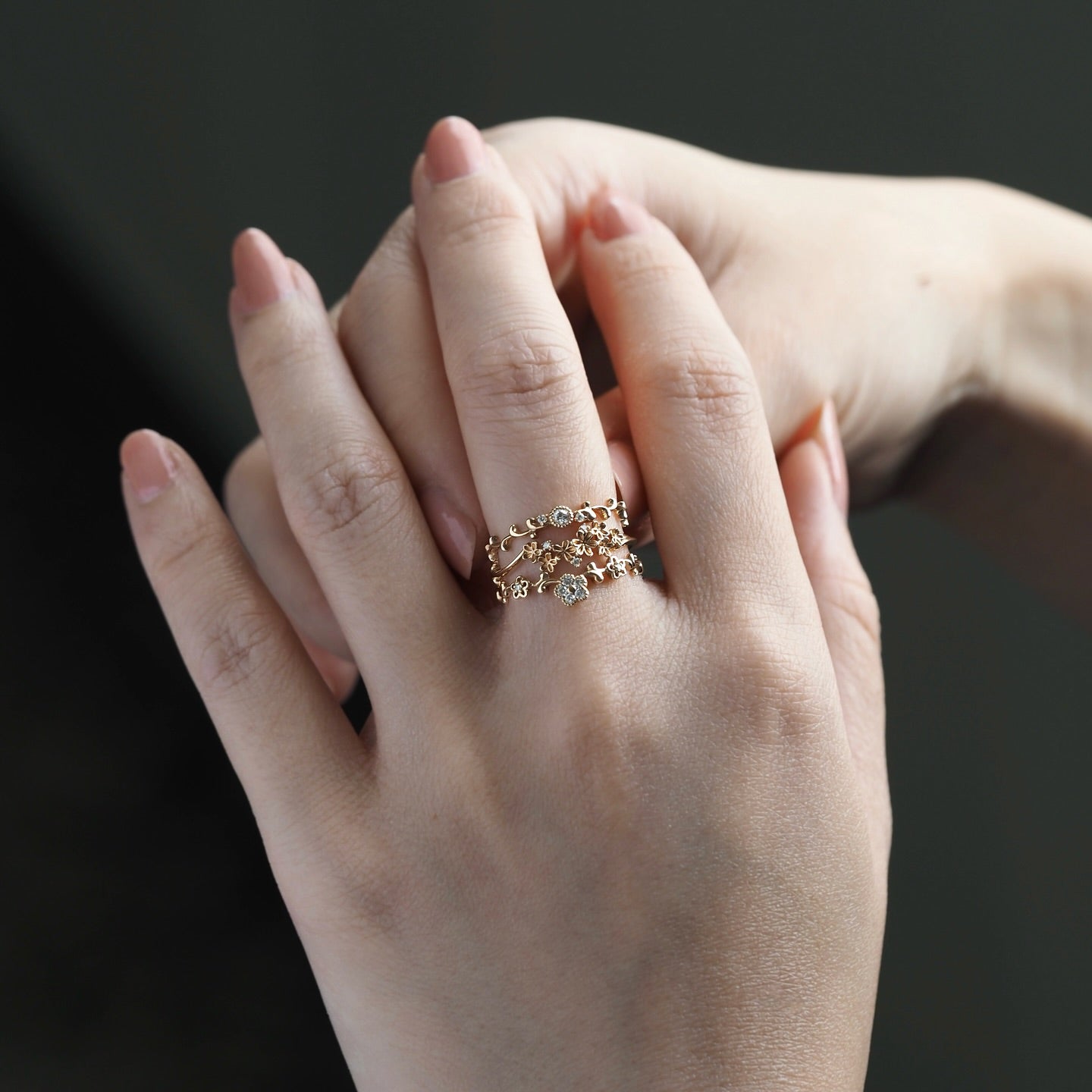 花や植物をモチーフにしたリングを重ねて、自分だけの花束のように楽しめます。カラーストーンと組み合わせるとより華やかなブーケリングに。