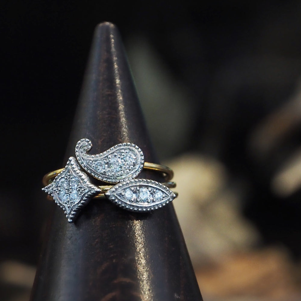 まばゆい星々のようなダイヤモンドを、5種のモチーフに閉じ込めました。リング、ネックレス、ピアスと、お気に入りのモチーフでコーディネートいただけます。