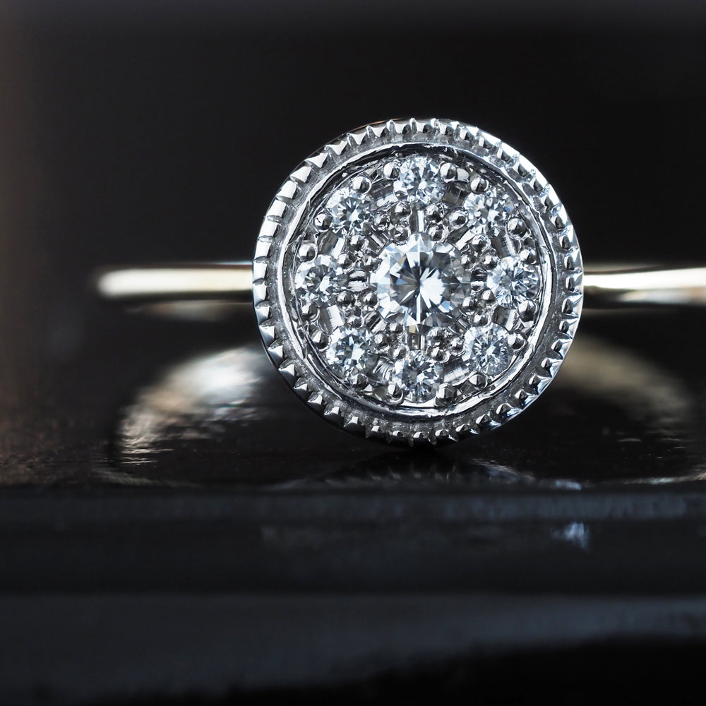 プラチナの台座にダイヤを散りばめ、枠と石留めのミル打ち装飾がより一層輝きを高めます。